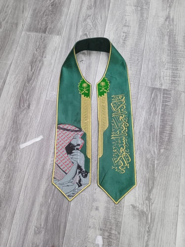 احتفلوا باليوم الوطني السعودي بأسلوب يعبر عن فخركم وانتمائكم مع وشاحنا الوطني المميز. تم تصميم هذا الوشاح بدقة عالية وتطريز متقن ليعكس الروح الوطنية الأصيلة، حيث يجمع بين الجودة الفائقة والتصميم العصري الذي يناسب جميع أفراد العائلة.